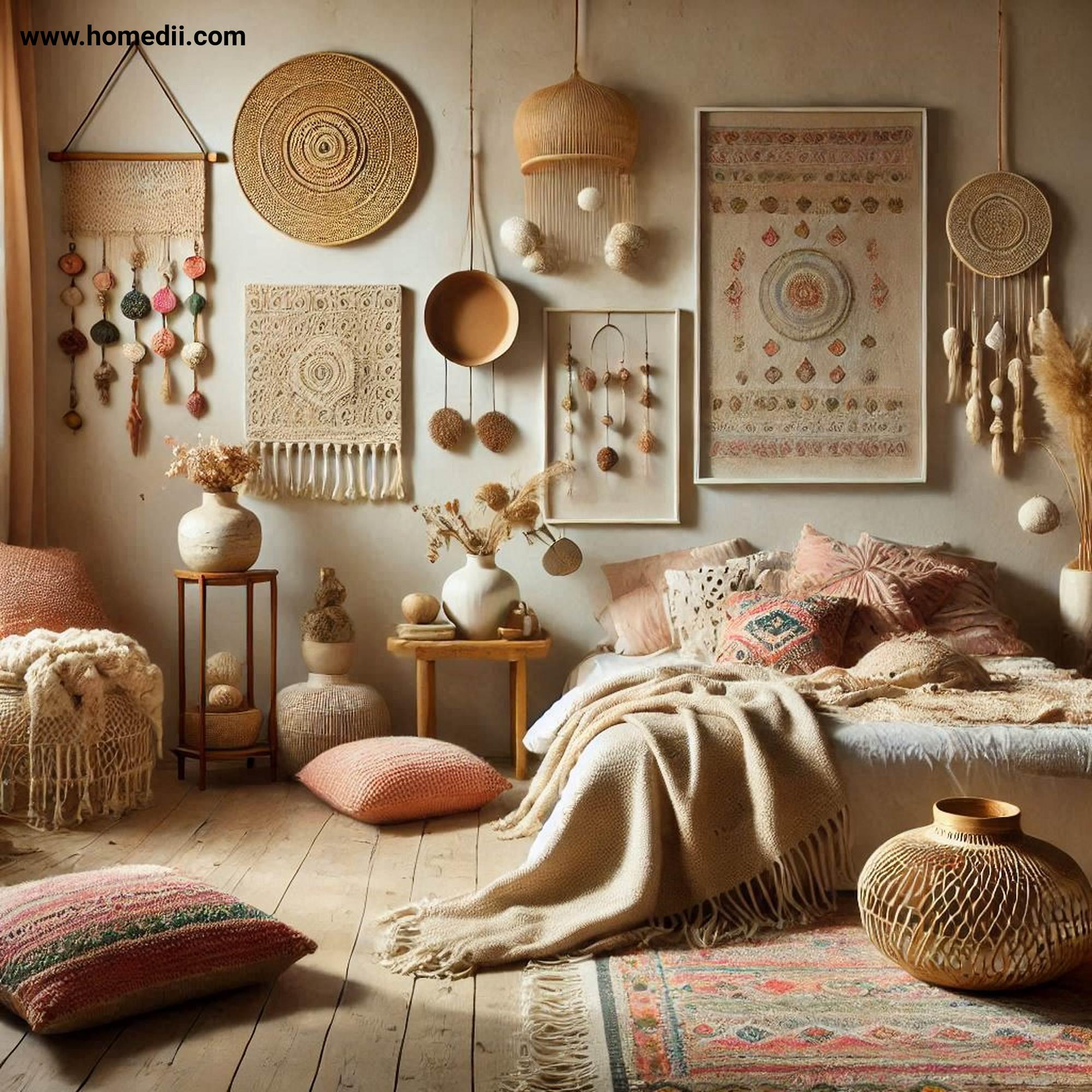 The design idea is involving Eclectic Art Pieces, Macramé Hangings, Framed Prints.